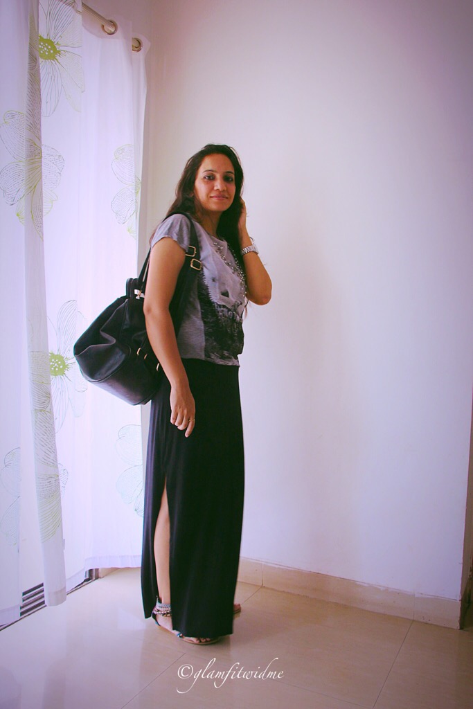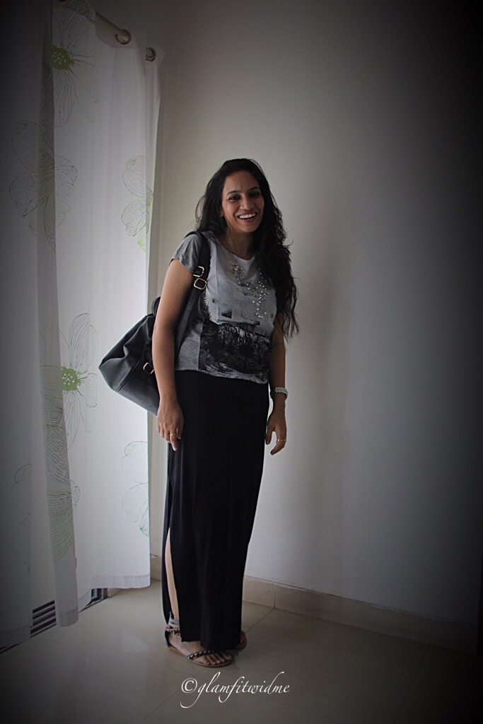 This time I chose a straight fit black maxi skirt with a high side slit, which (to me) looked so chic and stylish. I wanted to be on a casual side and wore the skirt with a simple grey printed top from Mango. I styled it with a beaded silver neck-piece and flat gladiator from Catwalk. I absolutely love the way it fits and that side cut giving an edge to the overall look. With minimal makeup and basic accessories, I am all ready for the day. Yepeee ……:)