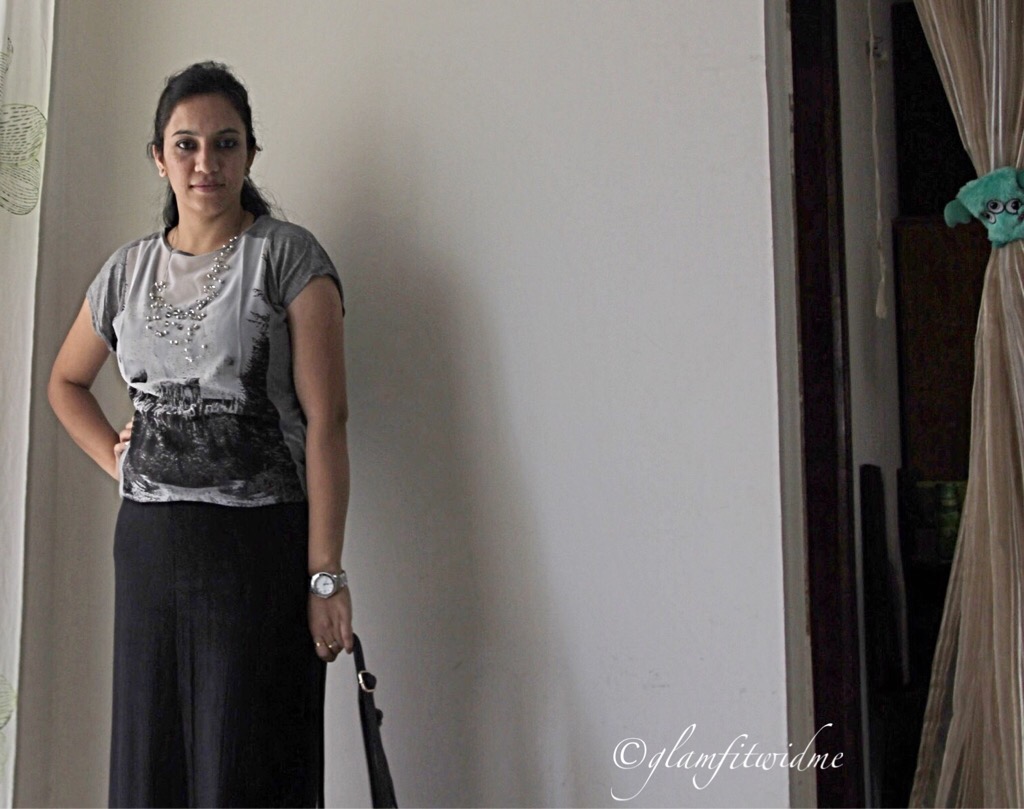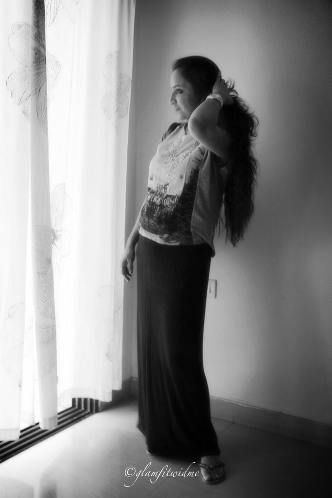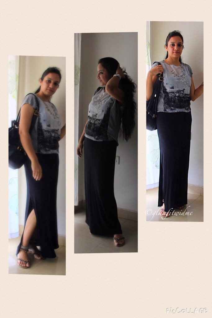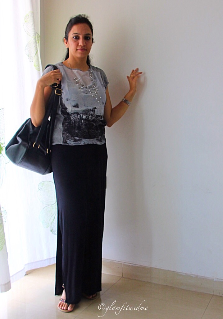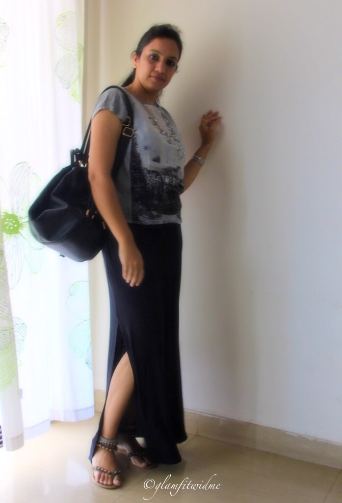 This time I chose a straight fit black maxi skirt with a high side slit, which (to me) looked so chic and stylish. I wanted to be on a casual side and wore the skirt with a simple grey printed top from Mango. I styled it with a beaded silver neck-piece and flat gladiator from Catwalk. I absolutely love the way it fits and that side cut giving an edge to the overall look. With minimal makeup and basic accessories, I am all ready for the day. Yepeee ……:)