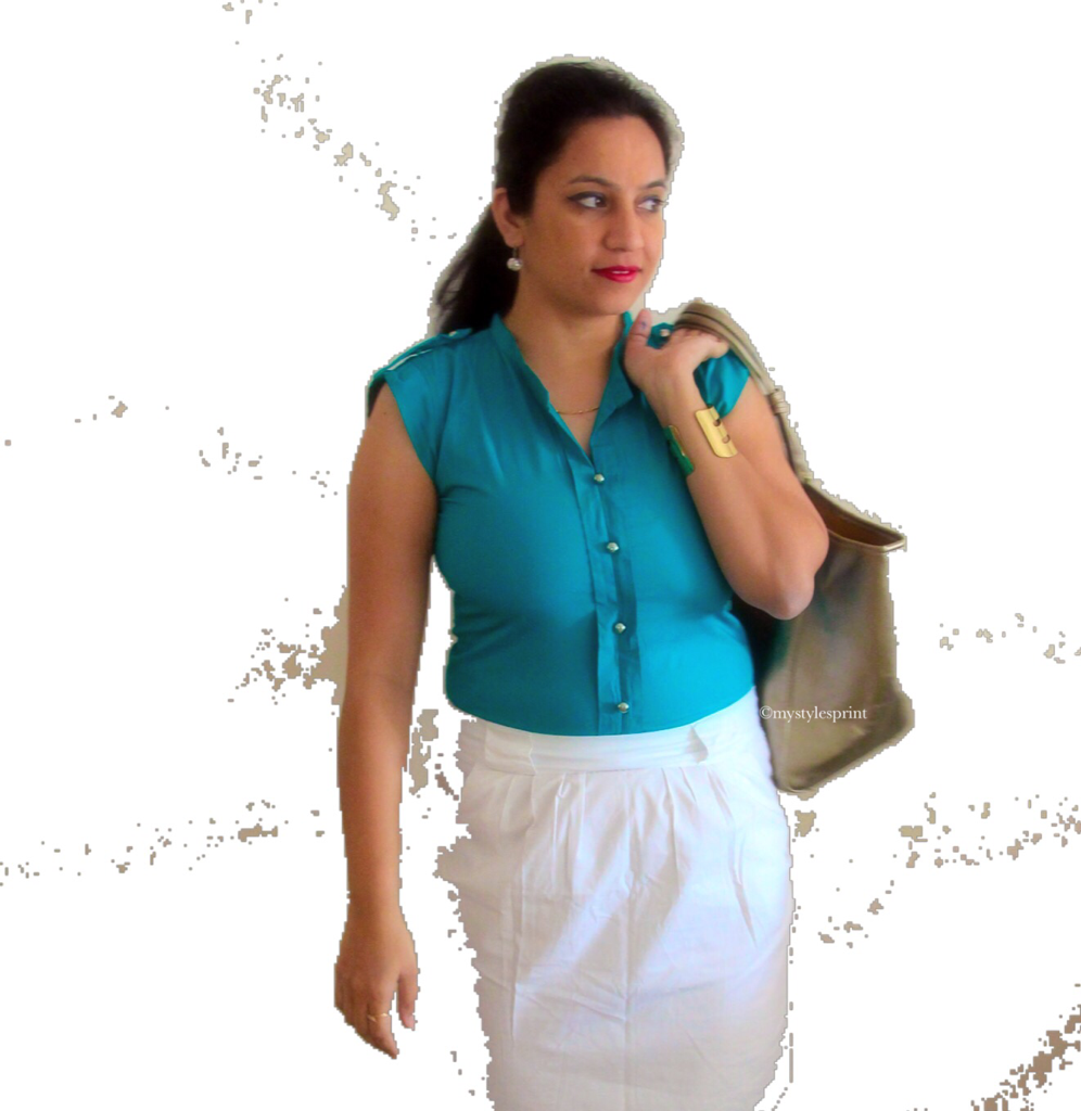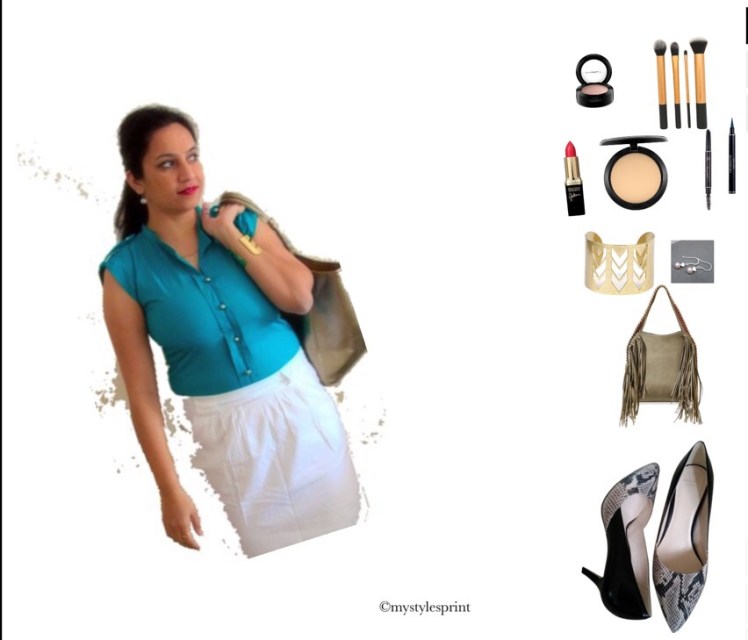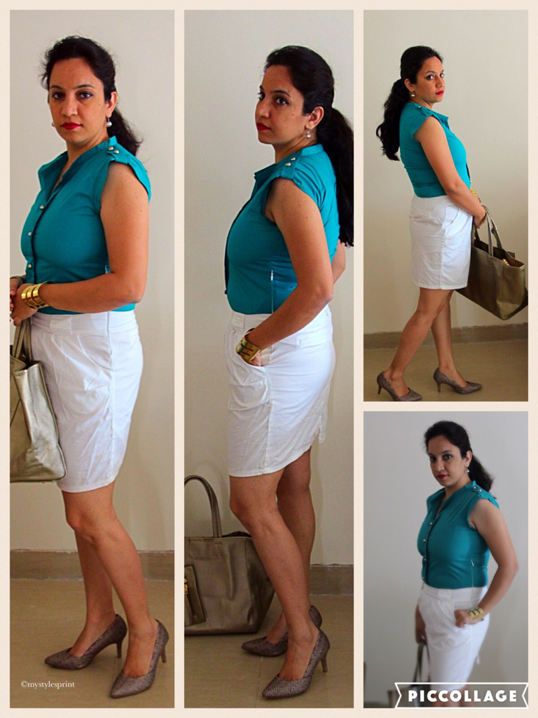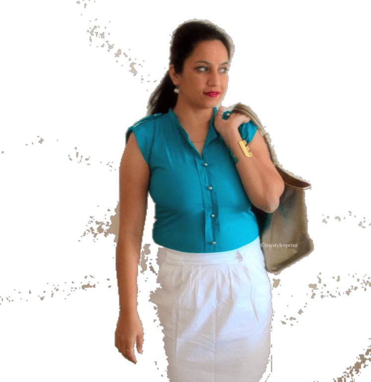 As I mentioned, it’s always safe to go and play around with neutral colors. I picked up this turquoise color blocked dress from Allen Solly. Honestly speaking, I wasn’t sure about too much colors embarked in one dress (it’s always a risky game). So, I prefer two color blocking that too with white keeping it more subtle. Here’s the glimpse of my look..