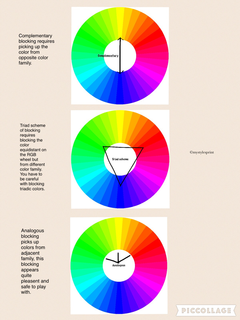 Spring is all about colors and their vibrant hues. One such trend, really delicate to handle is Color blocking. Color blocking is basically ensembling blocks of colors next to one another in clothing, fashion accessories, or even footwears. It’s all about popping of colors but one needs to be careful with them, as it can either go very well or it can prove to be a nightmare. The color blocking showcase a perfect sense of fashionable looks, when picked with right color combos. The soul of this trend is to play with colors, have fun with your look and yet staying chic. Now, here comes the science of color theory to create a fabulous look. I would probably highlight the game of colors with a glimpse of color scheme.